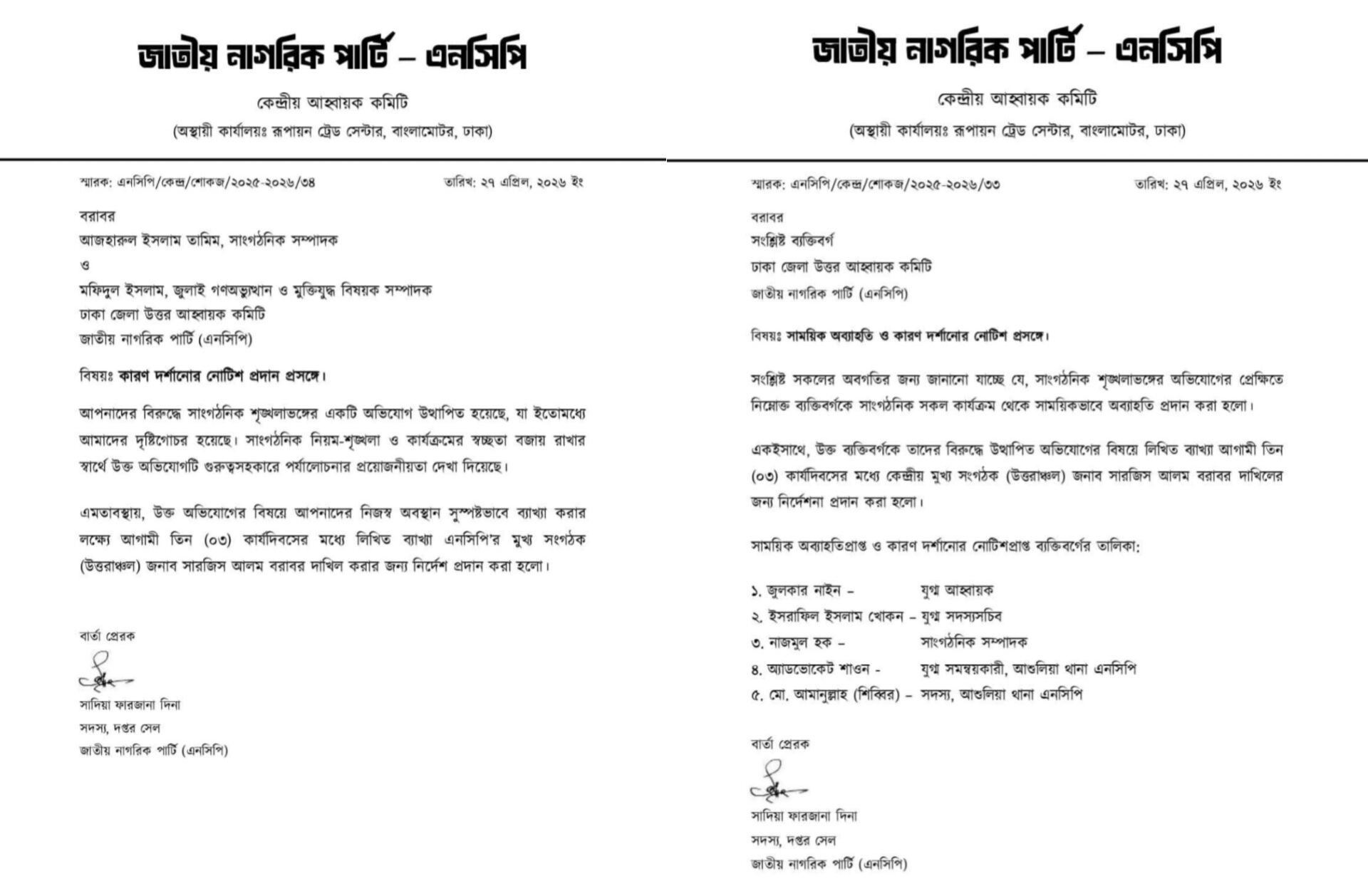 দলের কেন্দ্রীয় দপ্তর সেলের সদস্য সাদিয়া ফারজানা দিনা স্বাক্ষরিত একটি চিঠিতে জানানো হয় যে, সাংগঠনিক শৃঙ্খলাভঙ্গের অভিযোগের প্রেক্ষিতে ঢাকা জেলা উত্তর আহবায়ক কমিটির ৫ জন নেতাকে সাময়িকভাবে অব্যাহতি দেওয়া হয়েছে। তারা হলেন: জুলকার নাঈন (যুগ্ম আহবায়ক), ইসরাফিল ইসলাম খোকন (যুগ্ম সদস্যসচিব), নাজমুল হক (সাংগঠনিক সম্পাদক), অ্যাডভোকেট শাওন (যুগ্ম সমন্বয়কারী, আশুলিয়া থানা এনসিপি) ও মো. আমানুল্লাহ শিব্বির (সদস্য, আশুলিয়া থানা এনসিপি)।